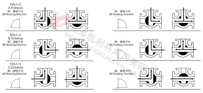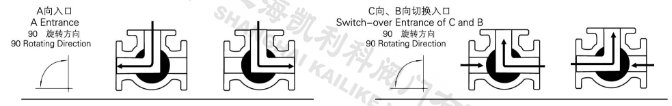 电动低温三通球阀分L型和T型,介质流通方向见下图。L型电动三通球阀适用于介质流向的切换,能使相互垂直的两个通道连通:T型电动三通球阀适用于介质的分流、合流或流向 切换,T型孔道可以使三个通道互相连通或使其中两个通道连通,电动三通球阀一般采用三个阀座结构,亦可根据用户要求采用四阀座结构。